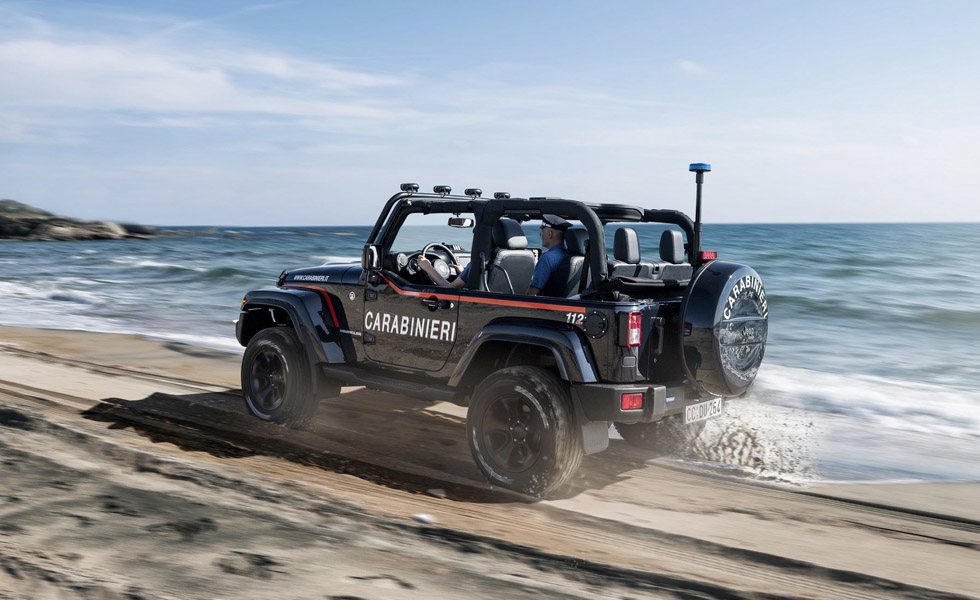 Los Carabinieri utilizarán este Jeep Wrangler para ejercer funciones de vigilancia y seguridad en las playas italianas y para ello esta unidad viene equipada con el paquete Mopar One Pack que ayuda a elevar sus suspensiones cinco centímetros y se equipa con llantas específicas de 17 pulgadas.