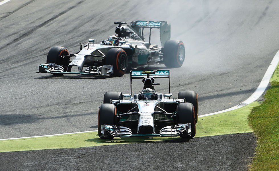 1, 2.- Se acelera a fondo a través de la Tribuna del Rettifilio -la recta de meta- donde se alcanza la velocidad máxima del campeonato al llegar a la chicane de la primera variante, que este año alcanzará registros superiores al pasado año gracias al aumento de prestaciones de los monoplazas. Deceleración brutal y con entrada muy bacheada, los nuevos y más altos pianos han hecho más crítica la frenada o una posible salida de pista. Uno de los puntos clásicos de adelantamiento del circuito. Frecuentes toques inmediatamente después de la salida.