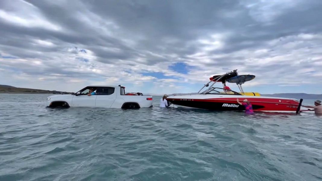 Se trata de una maniobra extremadamente delicada para cualquier automóvil, incluidos los mejores 4×4, que en este caso el Rivian lo supera como si tal cosa. Entra, gira, permanece segundos en el agua y vuelve a salir. Según el propietario, respetando eso sí la profundidad de vadeo homologada por el fabricante, que es de 1,09 metros.