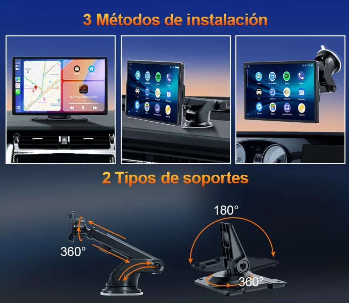 Otro de sus puntos fuertes es su facilidad de instalación. A diferencia de otros sistemas de infoentretenimiento, que requieren desmontar la radio o pasar por el taller, este dispositivo se coloca directamente sobre el salpicadero con sus soportes incluidos. El montaje es similar al de un soporte para smartphone.