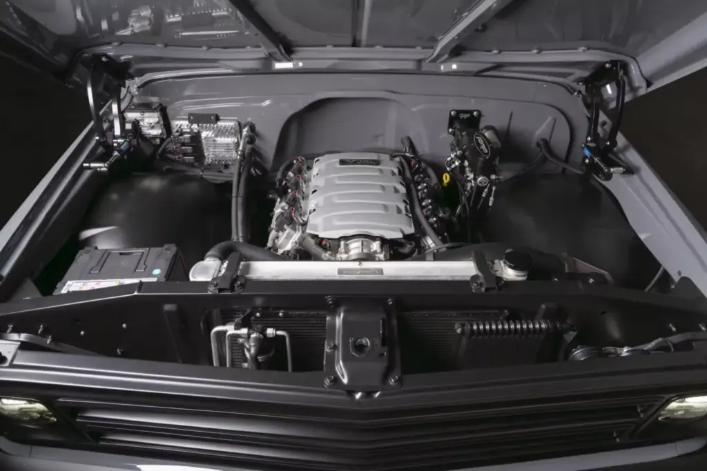 Bajo el capó delantero late un corazón que es pura modernidad. Y es que Velocity Restorations se ha decantado por el mítico LT1 de General Motors, que no es otro que el 6.2 V8 atmosférico que mueve a deportivos de la talla del actual Chevrolet Corvette, conservando sus 460 CV de potencia originales. Esta cifra se gestiona a través de una transmisión automática de 10 velocidades y se combina con un completo sistema de escape personalizado y donde no faltan unos silenciadores Borla que añaden un rugido grave y adictivo para no dejar indiferente a nadie. Importante detalle es que esta máquina pierde su sistema de tracción a las cuatro ruedas para convertirse en una máquina de propulsión posterior para acentuar su deportividad.