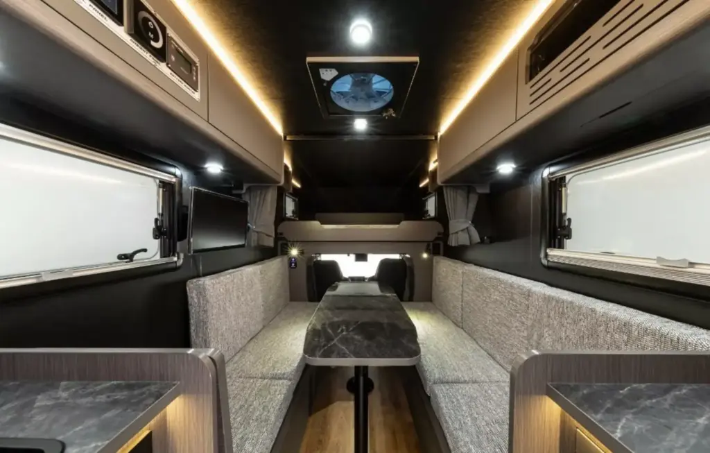 A pesar del tamaño reducido, Direct Cars ha conseguido integrar un equipamiento envidiable en su Dune Rover. No falta un fregadero con agua, microondas, nevera de 35 litros, televisor integrado, amplios armarios bajo la cama, iluminación ambiental LED regulable y aire acondicionado. Tampoco desentona el panel de control central ni múltiples puertos USB para mantener todos los dispositivos cargados durante la aventura.