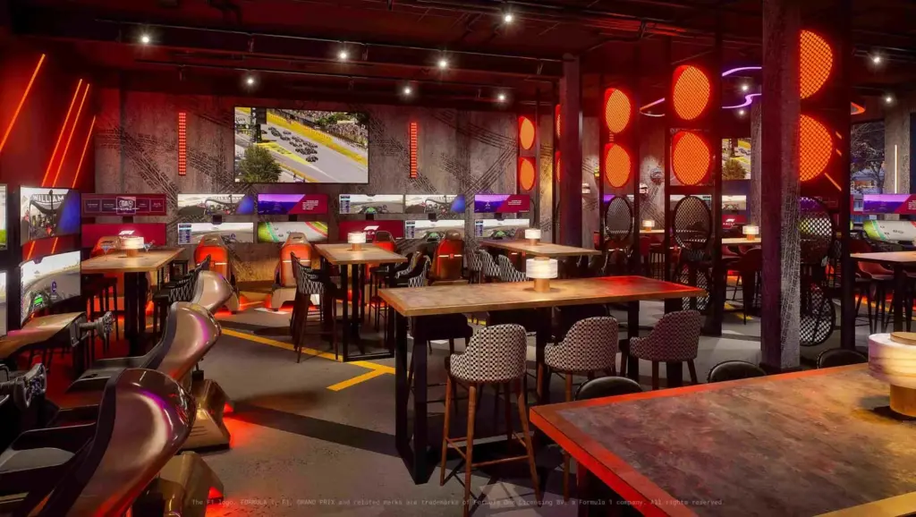 El diseño arquitectónico de F1® Arcade recrea la estética de la Fórmula 1 con lámparas de neón inspiradas en circuitos míticos, paredes decoradas con marcas de derrapes de neumáticos pintadas a mano e iluminación que evoca las luces de la parrilla de salida de un Gran Premio.