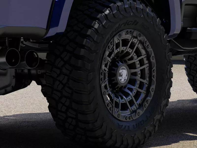 En el exterior tampoco podemos pasar por algo unas aletas que han sido ensanchadas y dotadas con extractores de aire donde no falta la firma de Shelby American, pero que son necesarias para poder instalar unas nuevas llantas de 20 pulgadas que se calzan con neumáticos BF Goodrich KM3 Mud Terrain especialmente pensados para el uso off-road. También hay unos estribos eléctricos y con luces integradas, así como ofrecen la posibilidad de adornar su enorme carrocería con adhesivos pertinentes como opción.