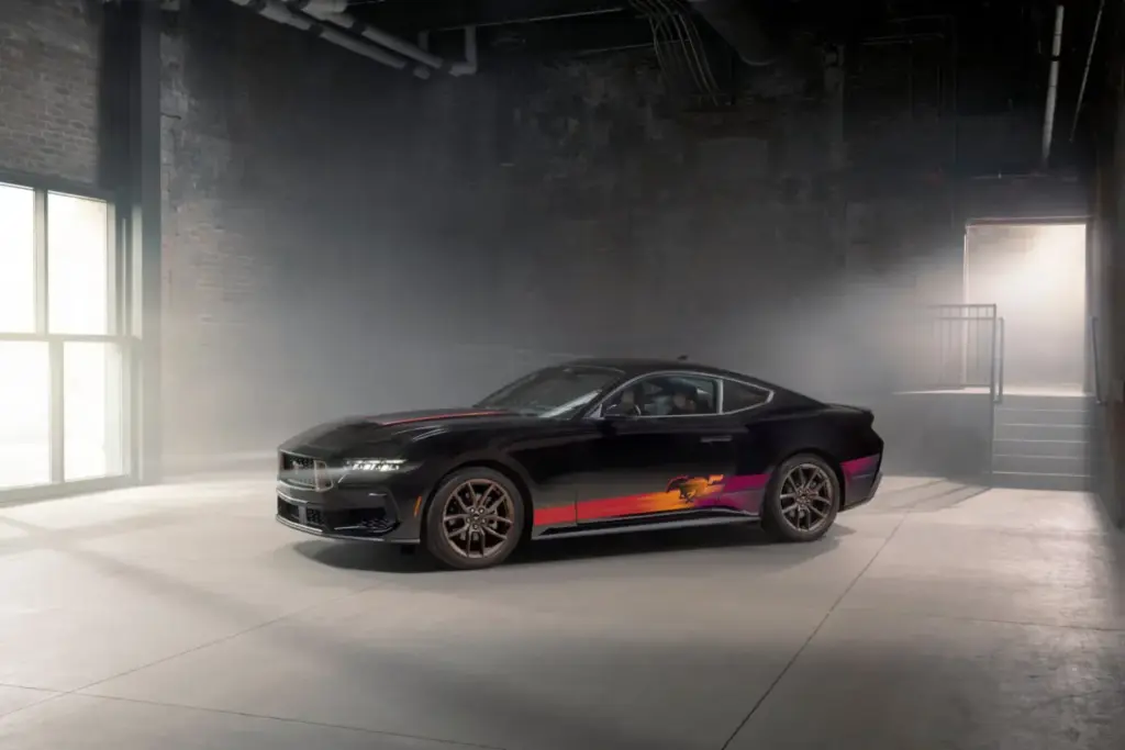 Este paquete transforma de manera radical la estética del Ford Mustang EcoBoost, convirtiéndolo en una edición limitada llena de carácter y de lo más colorido. Disponible exclusivamente con una carrocería en color Shadow Black, el TLD Signature Edition destaca por sus llamativos gráficos laterales que combinan a la perfección colores rojo, naranja, morado y amarillo, coronados por la silueta de un caballo al galope. Un diseño que evoca inmediatamente el espíritu dinámico y libre del pony car más icónico del mundo.