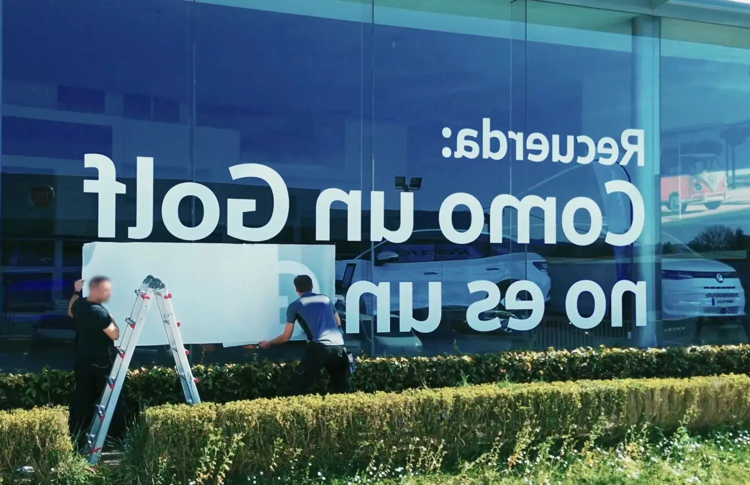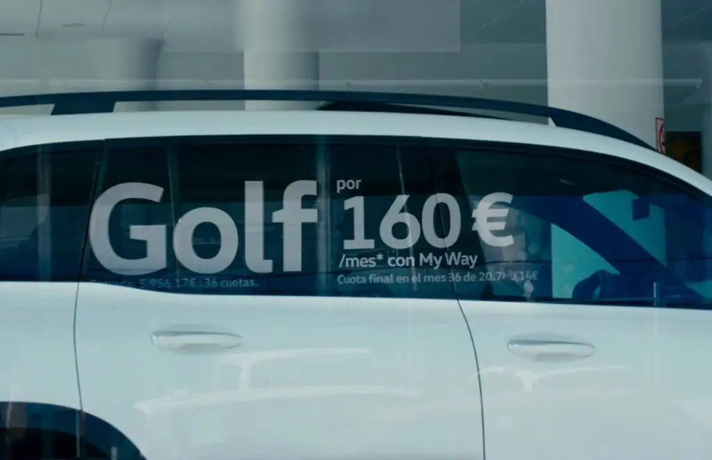 La compañía alemana ha puesto en marcha una campaña (ver vídeo arriba) en varios concesionarios de España que convierte la misma presión competitiva en argumento de marca. Aprovechando la proximidad cada vez más habitual entre puntos de venta de distintas marcas, Volkswagen ha invertido el nombre y el precio del Golf en las cristaleras de sus concesionarios. El resultado: cuando ese texto se refleja en los escaparates de enfrente, el mensaje se lee con claridad. «Como un Golf, no es un Golf.»
