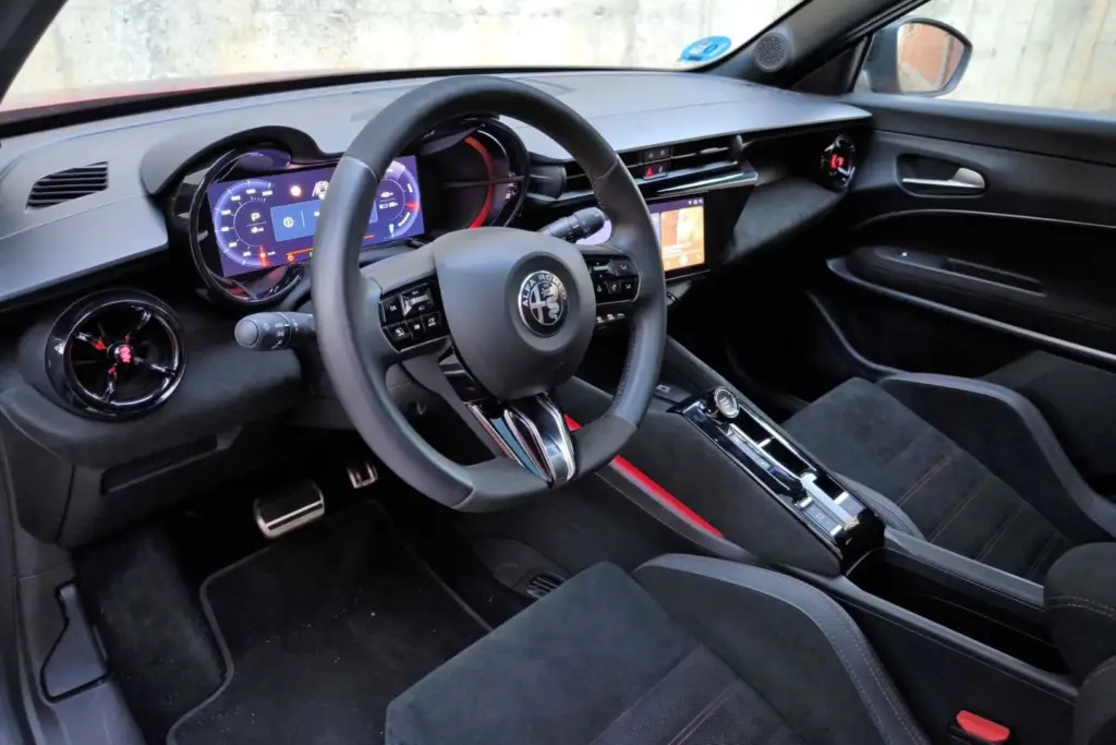 El habitáculo del Alfa Romeo Junior Elettrica 280 Veloce sigue la filosofía habitual de la marca: la consola orientada hacia el conductor, guiños estéticos a la historia de Alfa en el diseño del cuadro de instrumentos y en los aireadores, y una doble pantalla de 10,25 pulgadas para instrumentación y sistema multimedia. El conjunto transmite una sensación de calidad ligeramente superior a la de otros productos de Stellantis, aunque quien tenga ojo clínico reconocerá sin dificultad mandos de elevalunas, palancas de intermitentes, selector del cambio o botón de arranque compartidos con, por ejemplo, un Peugeot 2008.