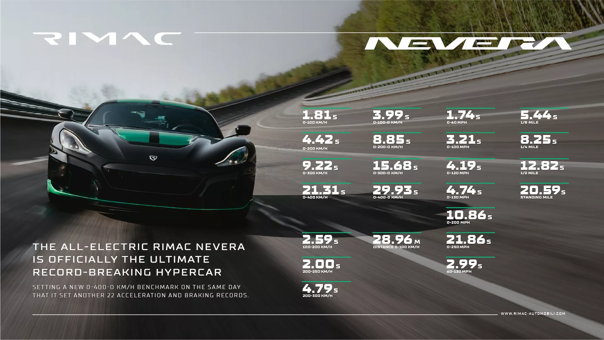 Sin embargo de lo que más orgulloso está la compañía croata es en haber superado a compañías como Koenigsegg o Bugatti en el registro 0-400-0. Este Rimac Nevera ha necesitado tan solo 29,93 segundos para acelerar de 0 a 400 km/h, para a continuación llegar a detenerse por completo. Ese tiempo es mejor que los 31,49 segundos de los que presumía desde 2019 el Koenigsegg Agera RS, quien a su vez arrebató el récord al Bugatti Chiron, que en 2017 paró el crono en 41,96 segundos.
