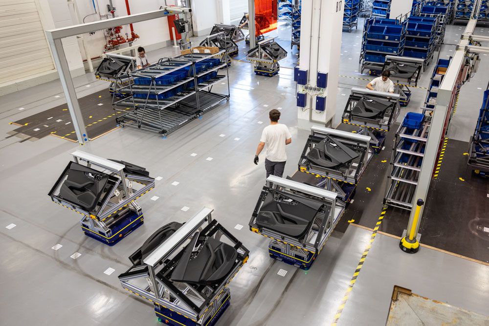 Aquí se trabaja montando paneles de puertas que son trasladador por vehículos de guiado automático (AGV, Automated Guided Vehicles) hasta la estación donde se ensamblan los componentes. Se reduce el tiempo de producción –hasta un 20 por ciento- y ahora, por ejemplo, un solo trabajador puede instalar el panel completo, cuando antes hacía falta dos o tres trabajadores, debido a los tiempos de procesamiento preestablecidos en una cadena de montaje. Además, con este sistema se puede emplear a personas que, debido a limitaciones físicas, ya no pueden trabajar en la línea de montaje.