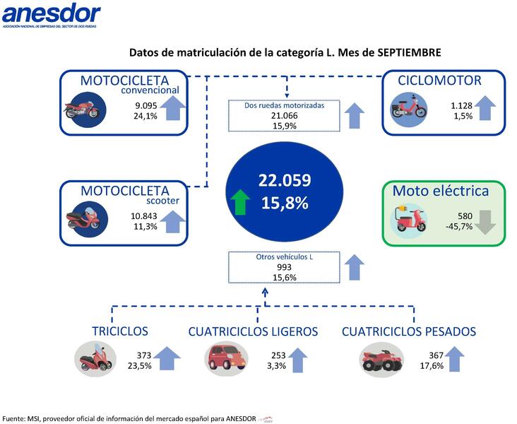 El mes de septiembre también ha sido favorable para otros vehículos de categoría L. Los triciclos han crecido un 23,5% (373 unidades), los cuatriciclos pesados un 18% (367 unidades) y los cuatriciclos ligeros un 3,3% (253 unidades). Esta tendencia indica que no solo las motocicletas están en auge, sino también otros tipos de vehículos ligeros, ampliando así las opciones de movilidad para los usuarios.