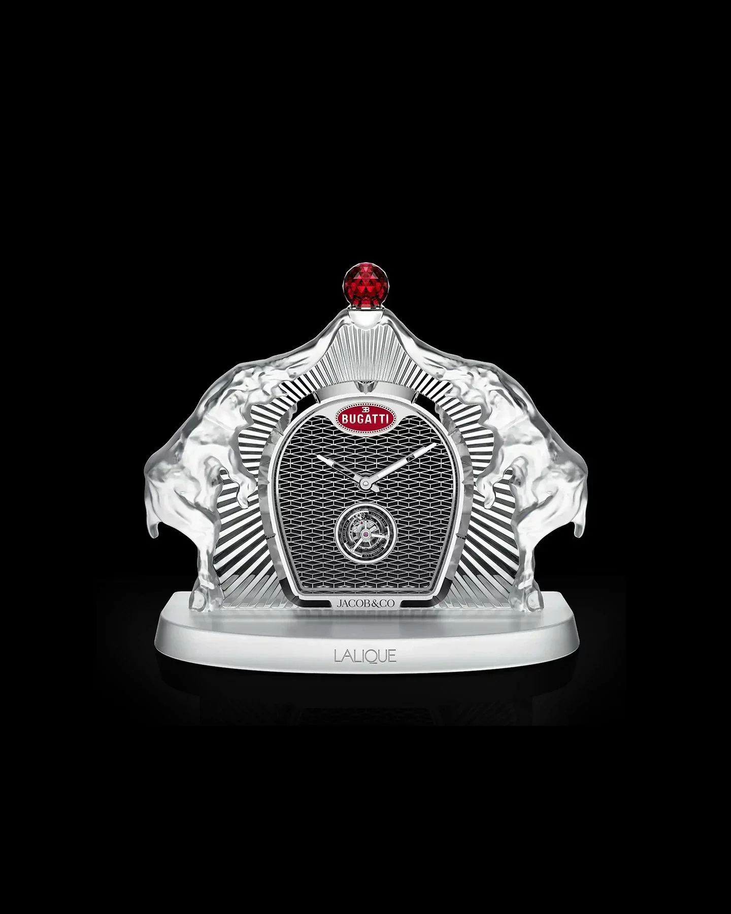 Sobre este marco de cristal Lalique de 26 centímetros se encastra el reloj de Jacob & Co coronado por una piedra preciosa roja de 30 mm tallada con 288 facetas; un corte muy complejo patentado por Jacob. El dial del reloj adopta la forma de herradura de la tradicional parrilla de Bugatti, mientras que el mecanismo del reloj es un tourbillon de 189 componentes con cuerda para ocho días.