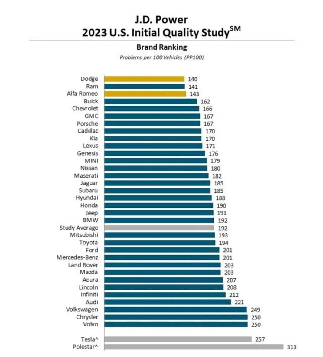 Tesla y Polestar ocuparían las últimas posiciones de la tabla elaborada por JD Power, pero estos fabricantes no están valorados oficialmente, ya que no otorgan permiso a JD Power para encuestar a sus propietarios en los estados donde se requiere autorización. Su puntuación se calcula en base a una muestra de encuestas a conductores de los otros estados. En este sentido, el estudio destaca que, mientras que Polestar mejora respecto a años anteriores, con Tesla ocurre todo lo contrario.
