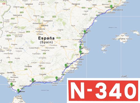 Conocida como la carretera del Mediterráneo, es la más larga de las nacionales de España. Une Puerto Real, en Cádiz, con Barcelona por toda la costa del Mediterráneo español, atravesando diez provincias y recorriendo 1.248 kilómetros. Su historia, su trazado, sus regiones, sus climas y sus paisajes la convierten en una de las vías más diversas y emblemáticas del país. Se trata de la N-340.