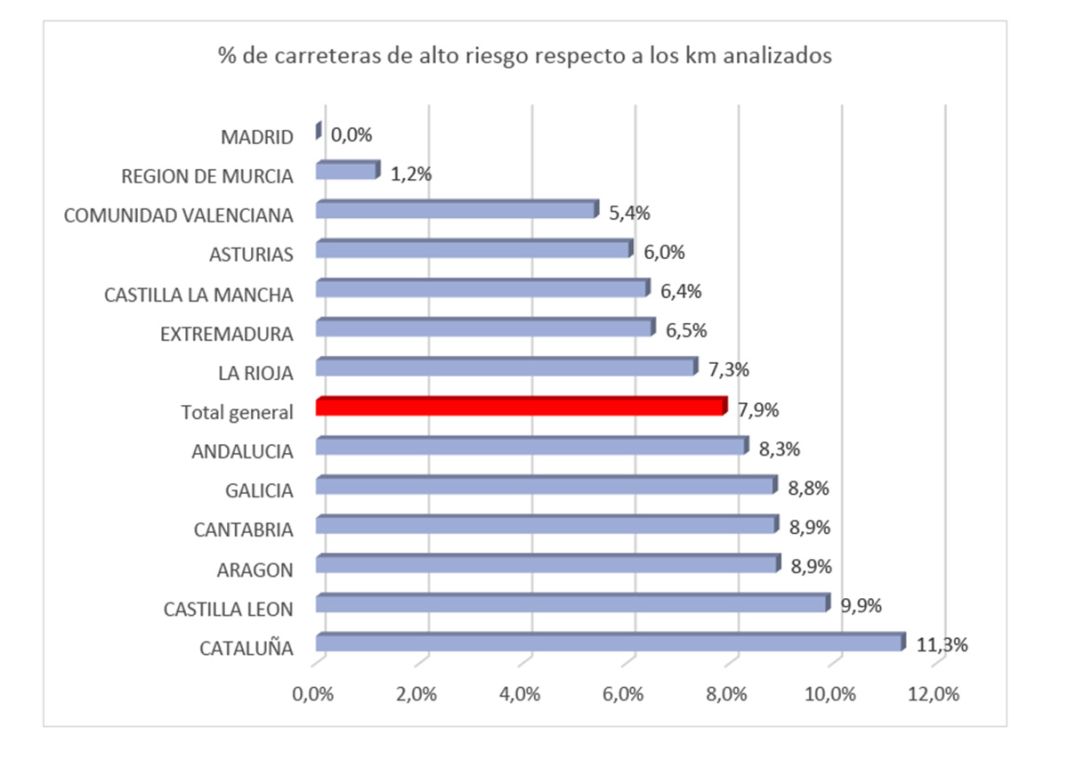 Por Comunidades Autónomas, Cataluña es la que presenta una mayor proporción de carreteras consideradas de riesgo elevado, con el 11,3% de vías, seguida de Castilla y León con 9,9 %. Aragón , Cantabria y Galicia le siguen con cifras muy semejantes de 8,9 y 8,8%.