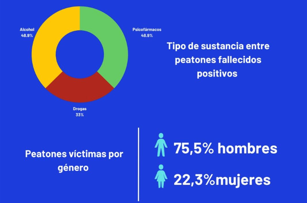Otro de los datos que destaca el informe es que, de los 221 peatones fallecidos por atropello, un 42,5% dieron resultados toxicológicos positivos en alcohol, drogas de abuso y psicofármacos, aisladamente o en combinación. Los peatones varones fallecidos también son mayoritariamente los que más resultados toxicológicos positivos arrojan, un 75,5% frente al 22,3% de mujeres.
