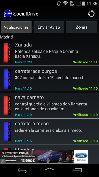 SocialDrive permite estar informados sobre la situación en las carreteras, pudiendo así tanto ver la vista general de la app como enviar nuestros propios reportes. Tendremos que escoger el tipo de aviso (radar, control, retención o accidente, helicóptero, etc.) y realizar una descripción breve sobre el mismo (por ejemplo: Radar en M40 altura Granada dirección A1