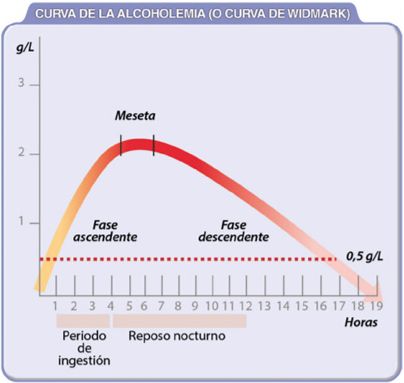 A la hora de determinar cuánto tarda el alcohol en desparecer de nuestro organismo hay recurrir inevitablemente a la “curva de Widmark”, más conocido como “curva de la alcoholemia”. Se trata de un gráfico que muestra como el alcohol puede empezar a detectarse en la sangre a los 5 minutos de haberlo ingerido, mientras que alcanza su pico de máximo nivel entre los 30 y 90 minutos siguientes. A partir de este pico máximo el alcohol comienza a desaparecer de la sangre muy lentamente hasta que se elimina por completo.