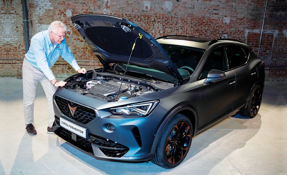 De partida, el Formentor cuenta con dos mecánicas. Por un lado el motor 2.0 TSI de gasolina, con inyección directa, turbo y una potencia de 310 CV asociados exclusivamente al sistema 4Drive de tracción total. La otra variante del Formentor integra la tecnología híbrida enchufable PHEV. Aquí, el motor de gasolina 1.4 TSI, que rinde 150 CV, se combina con otro eléctrico, de 115 CV, y con una batería de iones de litio de 13 kWh de capacidad. Esta tecnología, asociada siempre a la tracción delantera, ofrece una potencia conjunta de 245 CV, con una autonomía en modo exclusivamente eléctrico de unos 50 kilómetros, según ciclo WLTP. Por lo tanto, tendrá etiqueta 0 de la DGT. El tiempo de carga estimado del Formentor Plug-in en un enchufe normal de 230 V es de 6 horas, mientras que si se emplea una estación de carga wallbox, este se reduce hasta las 3 horas. Las dos opciones mecánicas del Cupra Formentor recurren al cambio automático de doble embrague DSG, que ya no está conectado mecánicamente con la caja de cambios, sino que utiliza una conexión electrónica para su funcionamiento y levas de nuevo diseño en el volante.
