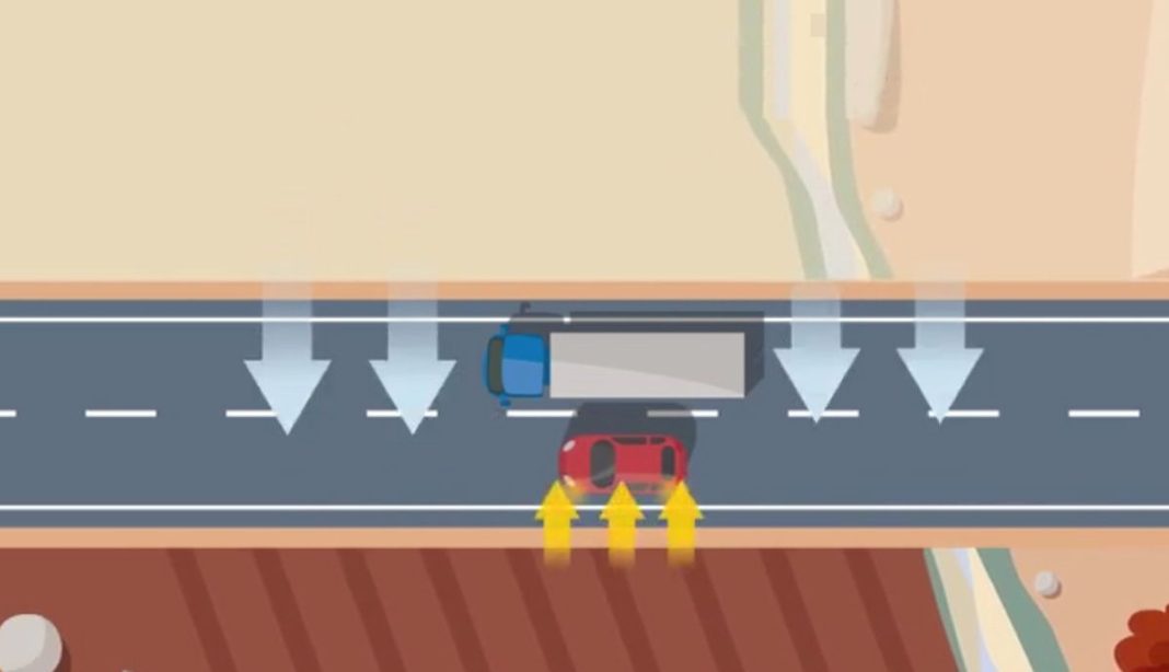 En el momento en el que el conductor sobrepase al camión, el viento empujará otra vez al vehículo hacia al lado contrario pero esto se puede evitar si corrige el volante a tiempo.