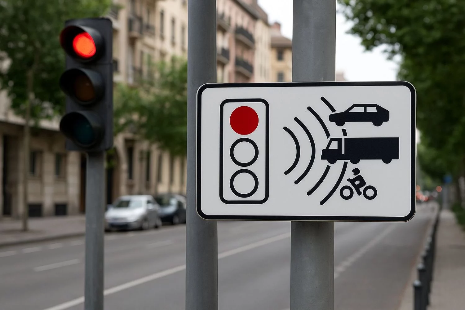 La señal en cuestión —ya activa en el catálogo de la DGT— muestra un semáforo en rojo junto a ondas de radar y varios tipos de vehículos (coches, motos, camiones). Su función es advertir al conductor de que la cámara está vigilando el cumplimiento del semáforo. Si pasas en rojo —incluso en ámbar, según el momento—, la cámara te va a hacer una ‘foto’.