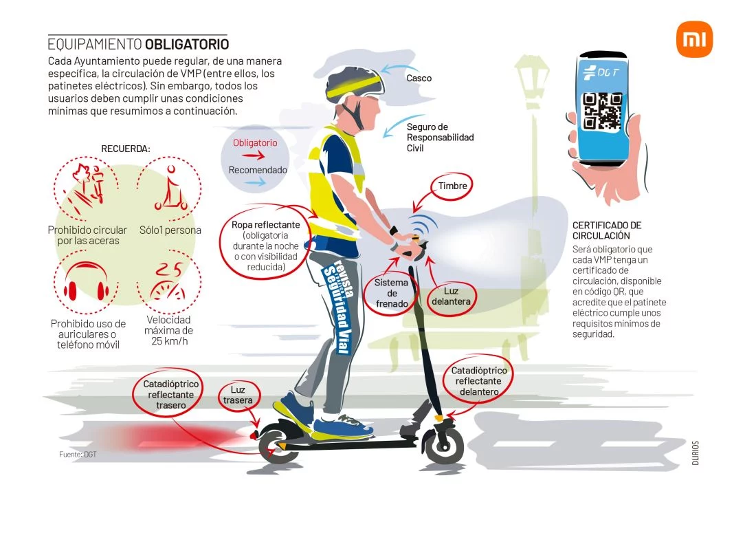Aunque no es obligatorio, se recomienda encarecidamente el uso de casco de seguridad, que protege en caso de caídas. Asimismo, el seguro de responsabilidad civil es aconsejable para cubrir posibles daños ocasionados durante el uso del scooter.