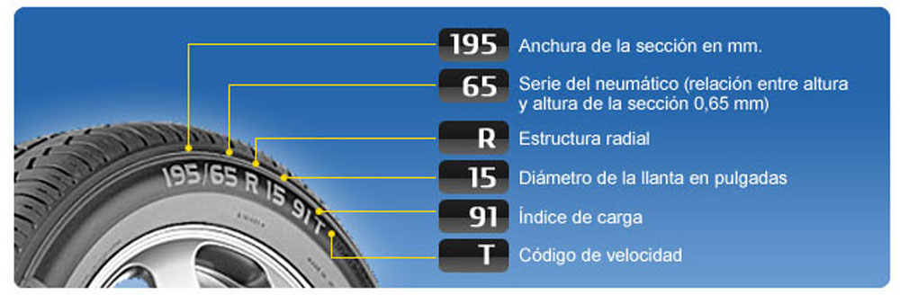 Mientras tanto 65 es el alto del perfil del neumático hacia afuera de la llanta, representado como un tanto por ciento del ancho de la goma. Se calcula dividiendo la altura de la sección por el ancho de la sección. Como es 65 quiere decir que su alto es un 65% respecto a su ancho. R es su estructura, en esta caso radial. El 15 hace referencia al diámetro de la llanta, pero en este caso en pulgadas. Y por último, 91 es el índice de carga y T el código de velocidad.