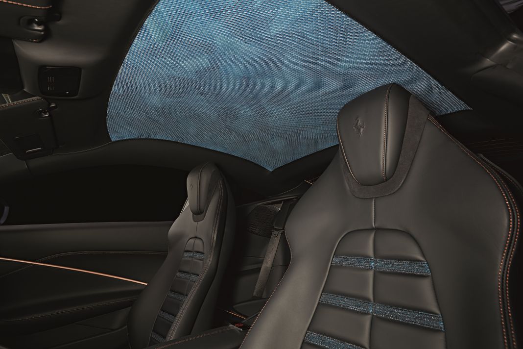 La temática del índigo se ha proyectado también sobre el techo del habitáculo. Desde Ferrari Tailor Made se ha creado una hermosa y detallada pieza de artesanía para disfrutar desde su interior. Está compuesta por dos pieles teñidas de índigo de Asai Roketsu, de Kioto.