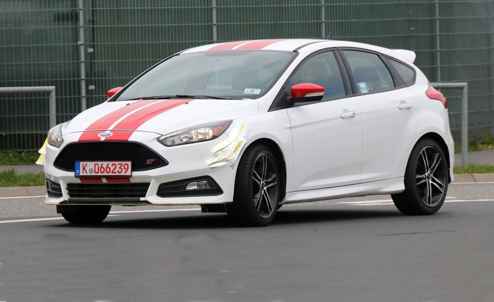 Ahora ese kit parece que lo van a convertir en una version especial, que podría denominarser ST Plus y que hemos pillado en los alrededores del circuito de Nürburgring. Sin camuflaje, hemos podido apreciar que este Focus tiene ciertos retoques aerodinámicos con unas aletas delanteras a ambos lados de los faros y un pequeño spoiler bajo la entrada de aire frontal.