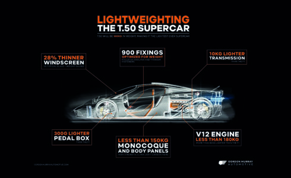 Y también es el quien con cuentagotas nos da información sobre este impresionante T.50, del que ahora sabemos que tan solo va a pesar 980 kilos. Y para que lo tengas en cuenta, según sus datos, eso son 456 kilos menos que la media de la competencia. Y es más, que sepas que un Hyundai i10 1.0 MPI con 67 CV de potencia pesa 994 kilos.
