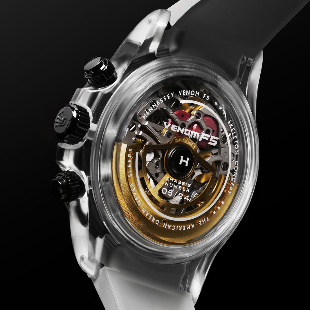Hennessey Special Vehicles, el fabricante de hipercoches con sede en Texas, se ha asociado con el fabricante de relojes Skeleton Concept, con sede en París, para presentar el Hennessey Venom F5 Concep. Un cronógrafo de edición limitada inspirado y emparejado, a través de un número de chasis inscrito, con una unidad del Venom F5 específica.