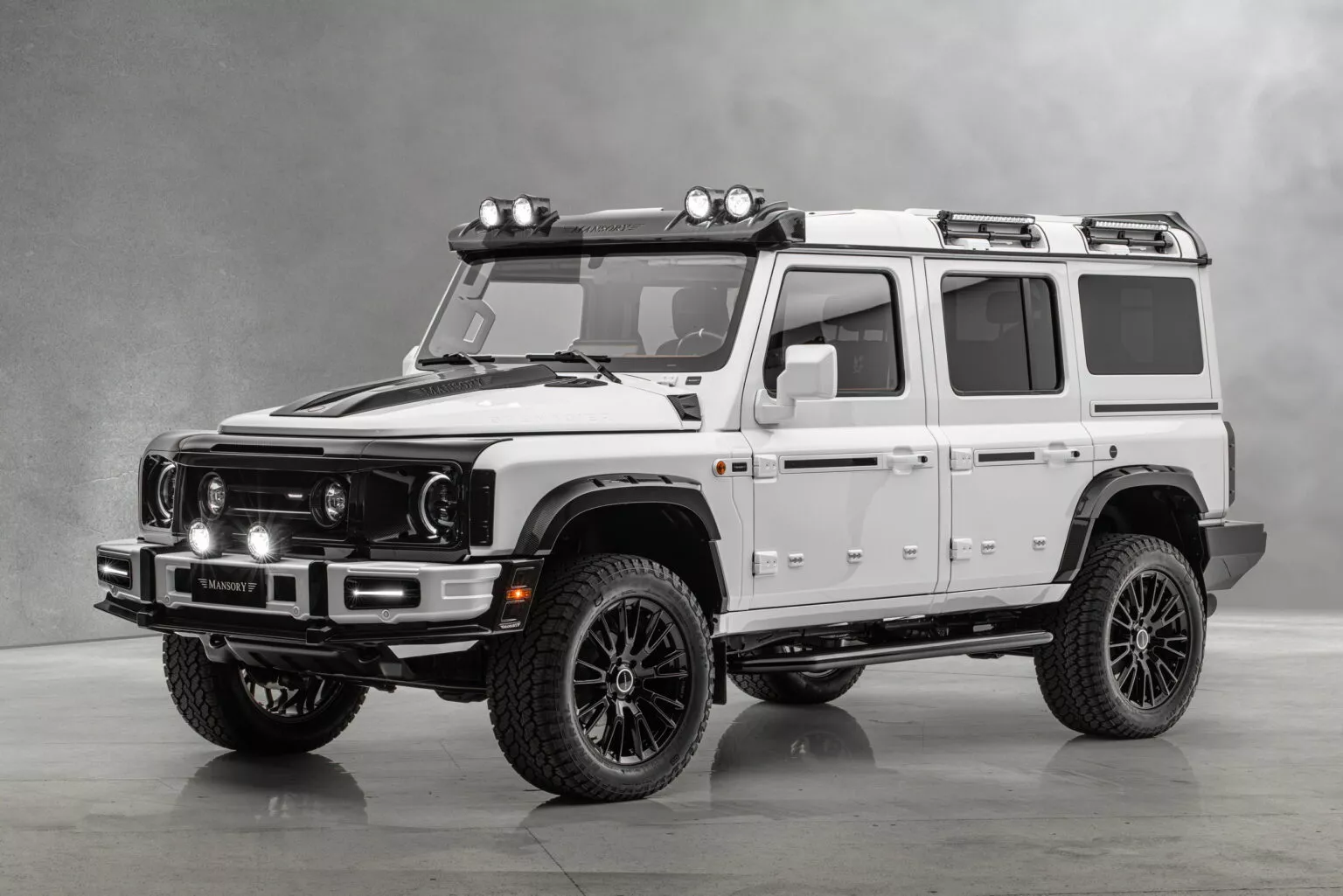 A diferencia de la inmensa mayoría de los vehículos que pasan por las manos de Mansory que se acercan aún más al asfalto, en este Ineos Grenadier se hace todo lo contrario, porque el especialista alemán ha instalado unos nuevos muelles que suman 20 milímetros a los 264 milímetros originales. Y es que los chicos de Mansory aseguran que han realizado «cambios importantes en el área de la suspensión» con el objetivo de mejorar la capacidad todoterreno de semejante criatura. De ahí que los nuevos estribos que luce en sus laterales le vengan como anillo al dedo para acceder de forma más cómoda a un interior que también se ha personalizado para la ocasión.