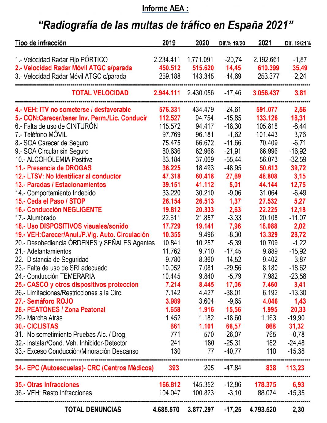 Según AEA, el hecho de que se hayan disparado las multas de tráfico en España en 2021, «evidencia la rápida recuperación de la actividad sancionadora llevada a cabo por la DGT» después de las limitaciones a la movilidad impuestas por el COVID-19 en 2020. De hecho, según la organización de defensa de los automovilistas, incluso se superan las cifras prepandemia de 2019, cuando se formularon 4.685.570 denuncias, la mayoría de ellas por exceso de velocidad (62%).