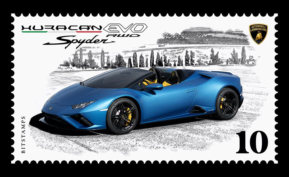 Este primer sello entra dentro de una serie temática (Automobili Lamborghini Collection) dedicada a la historia de la firma italiana y a más de dos decenas de sus coches. Este primer sello del Huracan EVO RWD Spyder ya está disponible descargando la aplicación Bitstamps, y está limitado a 20.000 unidades. Cada sello, que está numerado, es un único objeto digital, pudiendo ser comprado, coleccionado o revendido igual que un sello de papel.
