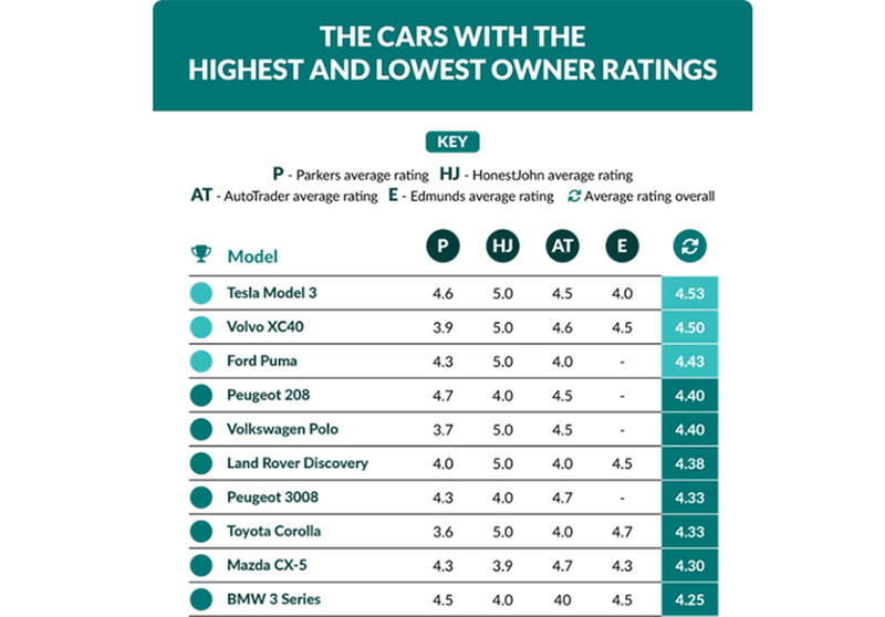 En este Índice de la felicidad del automóvil, el Tesla Model 3 ocupa el primer lugar como el automóvil mejor calificado, con una nota media de 4,53 sobre 5. Le siguen en la lista el Volvo XC40, el Ford Puma, el Peugeot 208 y el Volkswagen Polo completando el top 5 de los mejor valorados, con puntuaciones que oscilan entre 4,50 y 4,40 puntos. Completan los puestos del quinto al décimo lugar el Land Rover Discovery, el Peugeot 3008, el Toyota Corolla, el Mazda CX-5 y el BMW Serie 3.