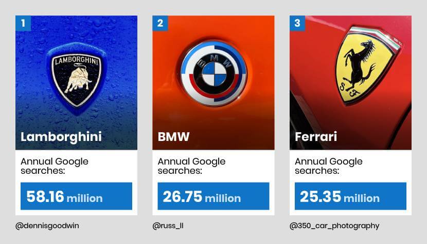 La marca que más repite en las búsquedas es Lamborghini, que coloca al Urus en segundo lugar, a su modelo Aventador en el octavo y al Huracán en el décimo puesto.