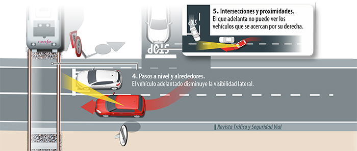 Si este vehículo se encuentra realizando la maniobra de adelantamiento, no debemos situarnos detrás, ya que nos impedirá ver, con el consiguiente riesgo de colisión.