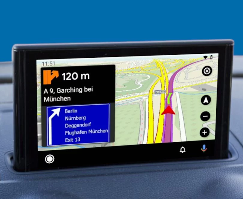 Una de las ventajas de MapFactor Navigator es su compatibilidad con Coolwalk, la interfaz de Android Auto que permite utilizar la app en un mosaico junto a otras aplicaciones (Spotify, WhatsApp, Telegram…). La función facilita el acceso a la música o los mensajes sin necesidad de cerrar la aplicación de navegación, lo que mejora la experiencia general al conducir.