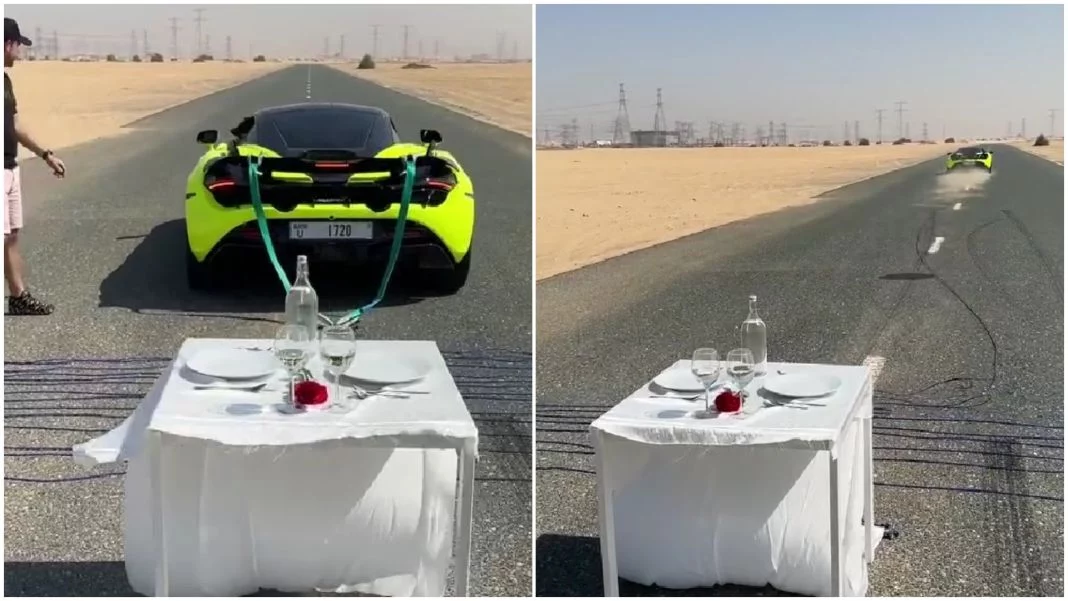 Dos hombres armaron una especie de cena romántica encima de una mesa con un mantel blanco atadado a una soga que llevaba directamente a un McLaren P1. Encima de ello pusieron dos platos, una rosa, dos copas y una botella de vidrio. La idea era probar que el coche de la marca inglesa podría quitar el mantel sin hacer caer ninguna de las piezas.