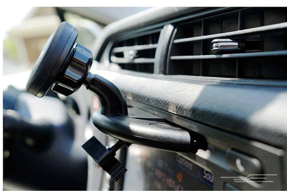 La tercera alternativa, si no te convencieron las demás, es la que se introduce justo donde está la ranura del CD. Y si, siendo sincero, actualmente son pocas las personas que utilizan esta abertura, ya que todos escuchan la radio o su música favorita a través de un cable auxiliar o vía Bluetooth. Encima, este accesorio cuenta con la capacidad para dar vuelta completamente el smartphone.