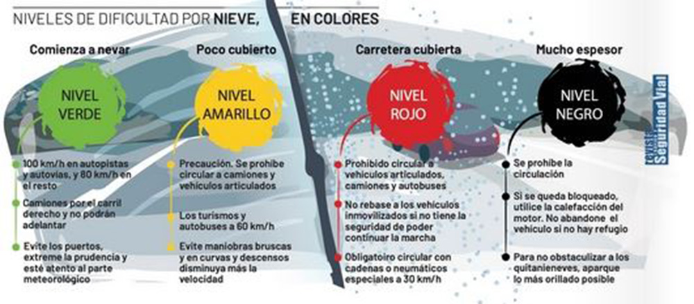 Extremar la precaución cuando se circule por las áreas y vías afectadas por las nevadas y «disponer de los medios y equipamiento adecuado para transitar en condiciones de seguridad, entre ellos cadenas o neumáticos de invierno«, son otras de las recomendaciones que hace la DGT.