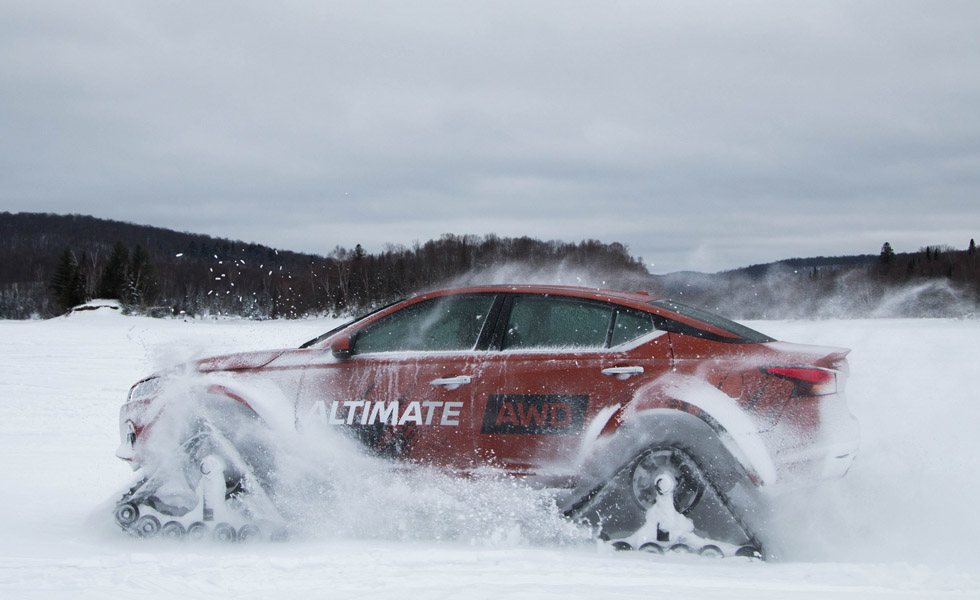Desarrollado para ser expuesto en el Salón de Montreal, el Nissan Altima-Te AWD prescinde de neumáticos, puesto que ahora apuesta por cuatro orugas fabricadas por el especialista American Track Truck. Cada uno de sus nuevos 'zapatos' mide 1,22 metros de largo, 38 centímetros de ancho y 75 centímetros de alto.