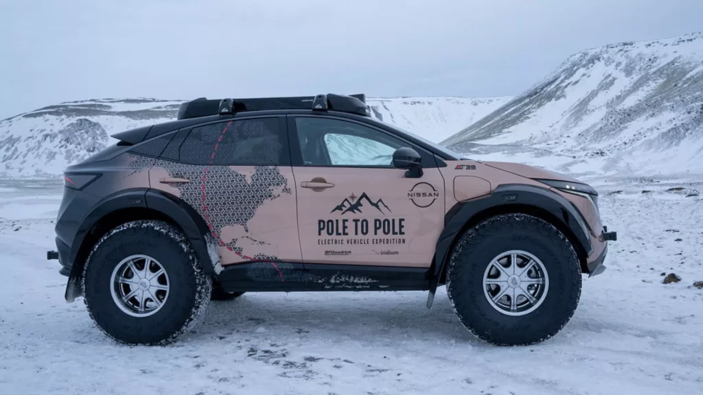 Embarcarse en un viaje de polo a polo significa ser capaz de enfrentarse a zonas nevadas, aunque eso es solo una pequeña parte del desafío al que se va a enfrentar este particular Nissan Ariya. Y es que el crossover eléctrico de la compañía nipona deberá lidiar con montañas, dunas… Y para que nada le pare se ha tenido que modificar a conciencia. Pero aún así se ha mantenido el diseño original.
