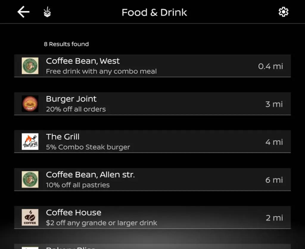 Para restaurantes, cafés o tiendas selecciona ofertas de locales cercanos o en establecimientos que están en el área del vehículo cuando el vehículo está parado o aparcado.