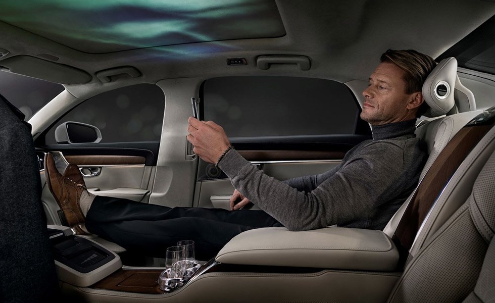 Volvo lo ha creado con tan sólo tres confortables asientos, pues el del acompañante ha desaparecido para dar lugar a un soporte para el pasajero posterior pueda dejar descansar sus piernas en los largos viajes. De la parte delantera incluso emerge una pantalla táctil que se posiciona frente al ocupante posterior. Ideado para ser conducido por un chófer, este incluso gozará de un confortable asiento que presenta un reposacabezas específico para él.