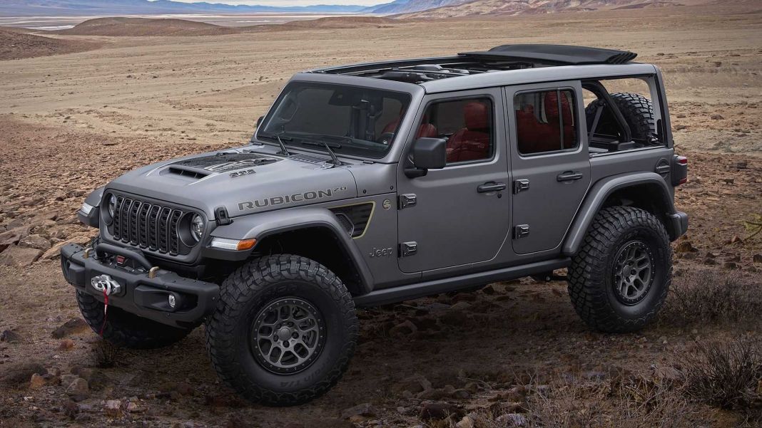 Este Wrangler Rubicon monta un motor V8 que rinde 392 CV. Lleva un escape doble, una toma de aire en el centro del capó, medias puertas hechas a medida y una capota eléctrica plegable con paneles laterales removibles.