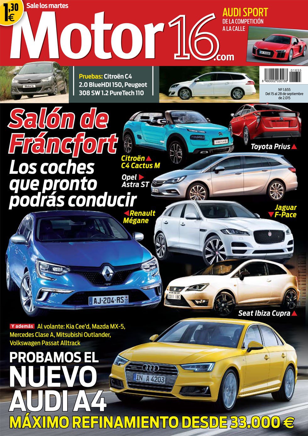 El Salón de Fráncfort muestra un aluvión de nuevos modelos que muy pronto estarán en el mercado. Renault Mégane, Kia Sportage, Porsche 911, Jaguar F-Pace, Toyota Prius… Además, conducimos los nuevos Audi A4, Kia Cee'd, Mercedes Clase A, Mazda MX-5, Volkswagen Passat Alltrack…