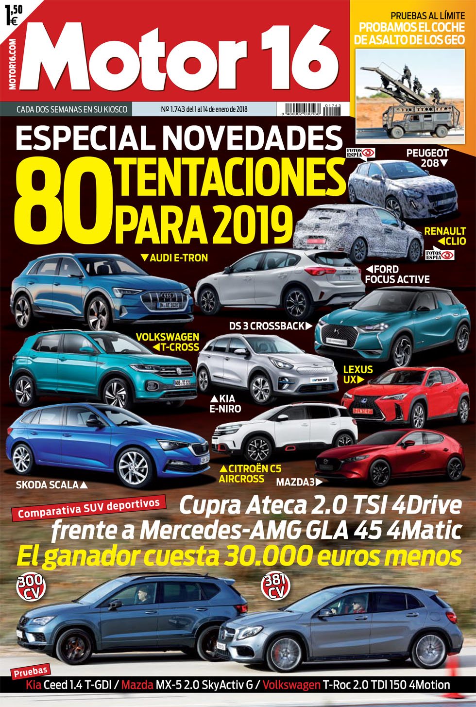 Más de 80 estrenos se van a vivir en este año 2019 recién estrenado. Repasamos todas las novedades que van a llegar. Además, comparamos dos SUV deportivos con mucho carácter, el nuevo Cupra Ateca de 300 caballos frente al Mercedes-AMG GLA 45 con 381 caballos. Y probamos a fondo el Kia Ceed 1.4 T-GDI, el Mazda MX-5 2.0 SkyActiv G y el Volkswagen T-Roc 2.0 TDI 150. Y también probamo el coche de asalto de los GEO.